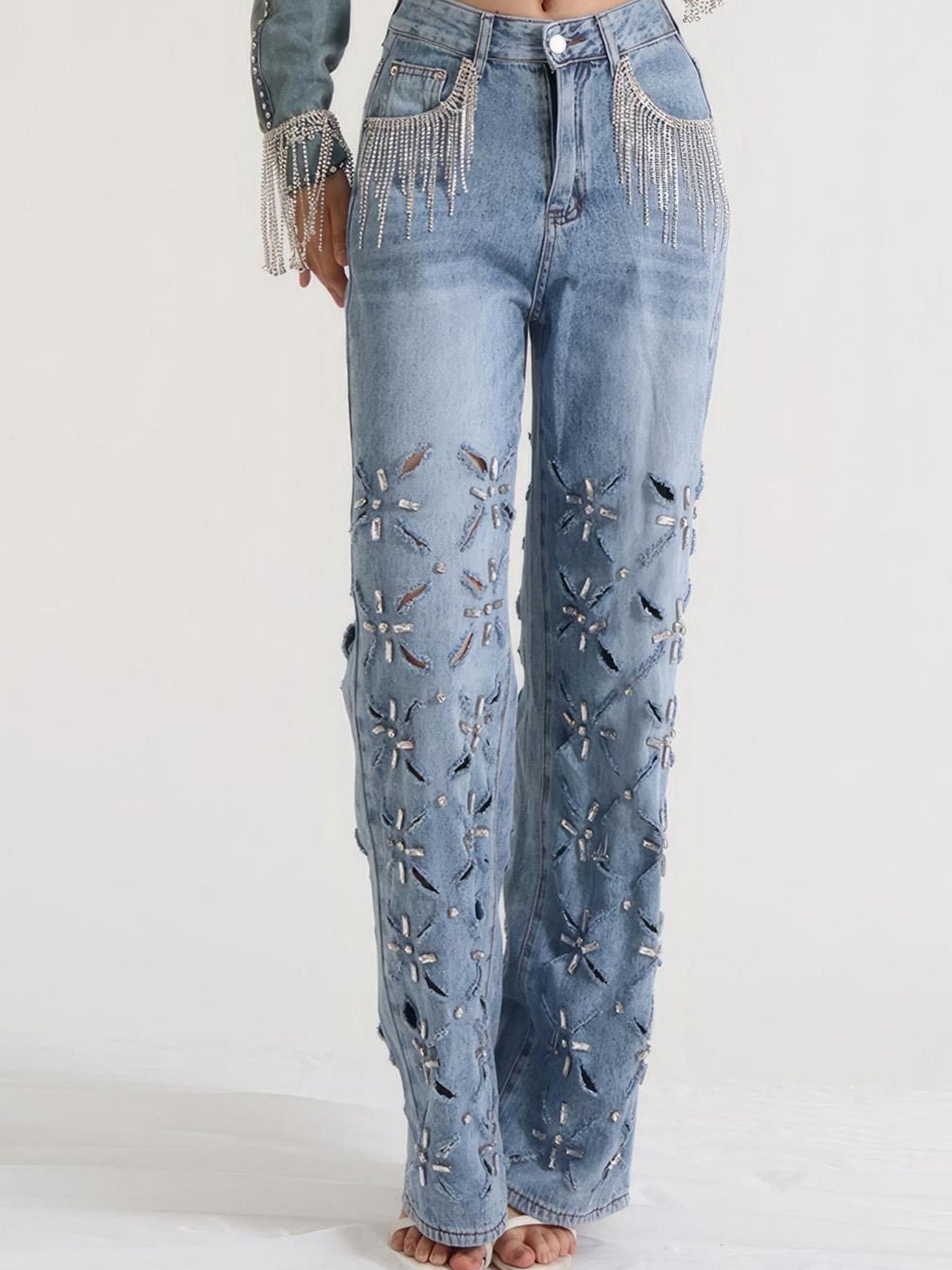 Get ready to dazzle in style with our Ruth denim jeans Featuring functional pockets, a front button and zipper closure, and hundreds of hand-pressed rhinestones for a diamond-like shine. Great stretch and these jeans are sure to turn heads and make you the center of attention. 52% Rayon, 26% Cotton, 21% Polyester, 1% Spandex