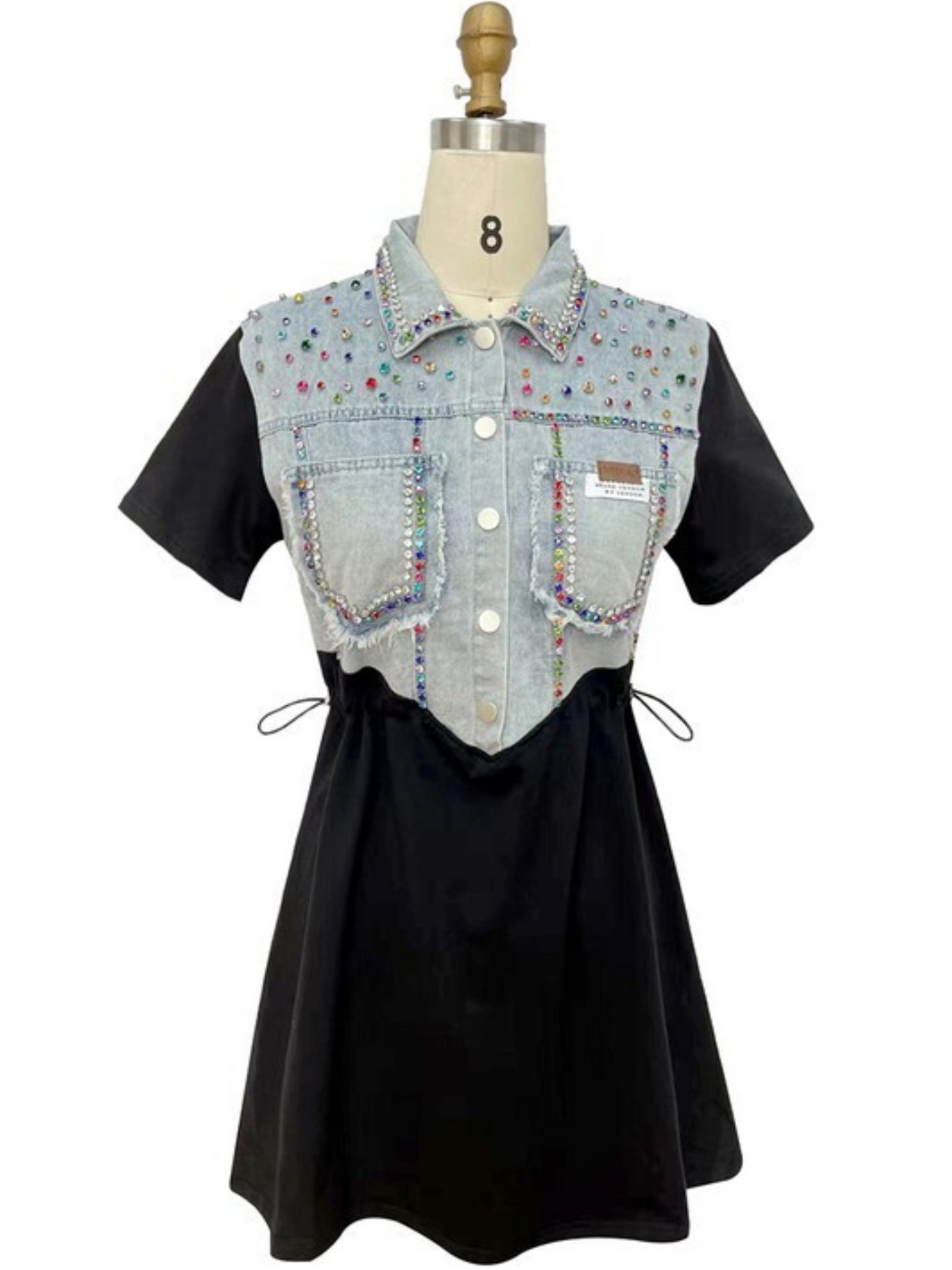 Drawstring Contrast Mini Casual Dresses Short sleeve contrast dress *Casual Dresses *Asymmetrical hem *Button front with chest pockets *Multi colored rhinestones embellishments *Drawstring waist *Tunic style