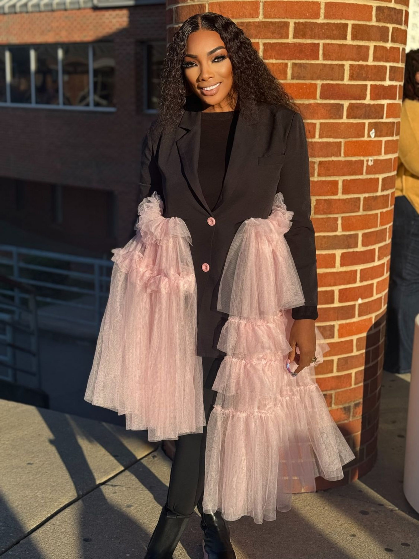 This avant-garde blazer dress combines classic tailoring with whimsical tulle ruffles. The oversized fit adds a modern twist, while the pink tulle inserts create a soft, romantic contrast against the structured black blazer. Perfect for making a chic statement at any fashionable event.