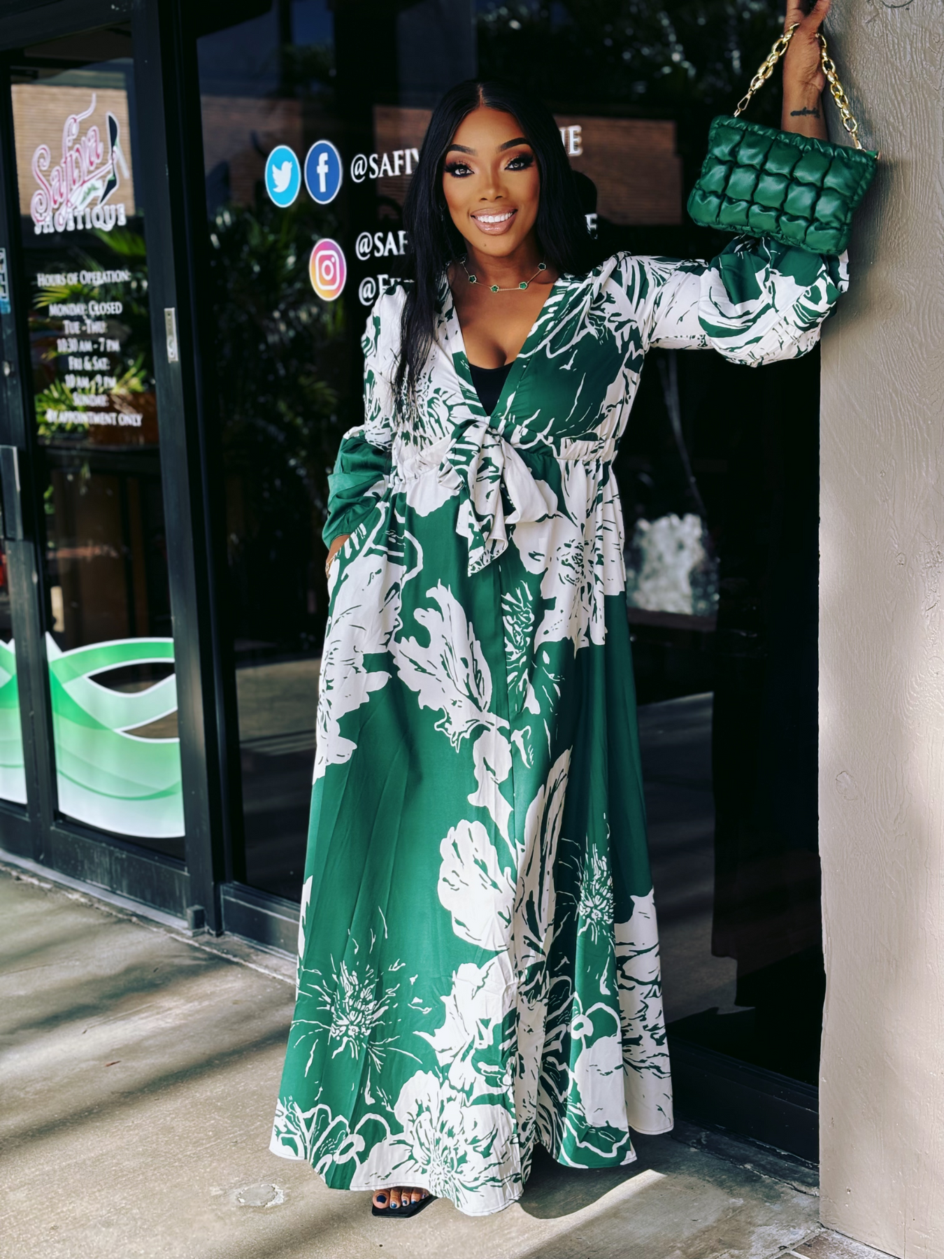 PRINTED V NECK MAXI DRESS -SELF TIE BOW -ADJUSTABLE WAIST -ELASTIC WAIST -POCKETS (POLYESTER 100%)