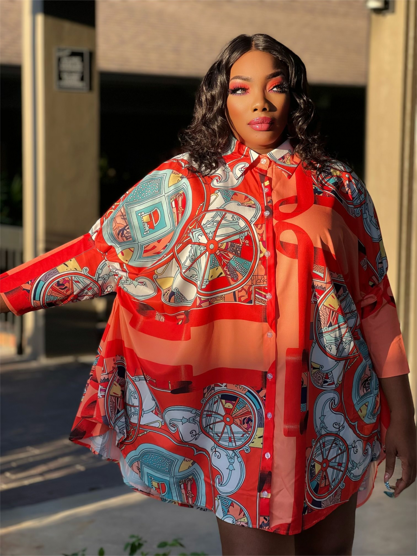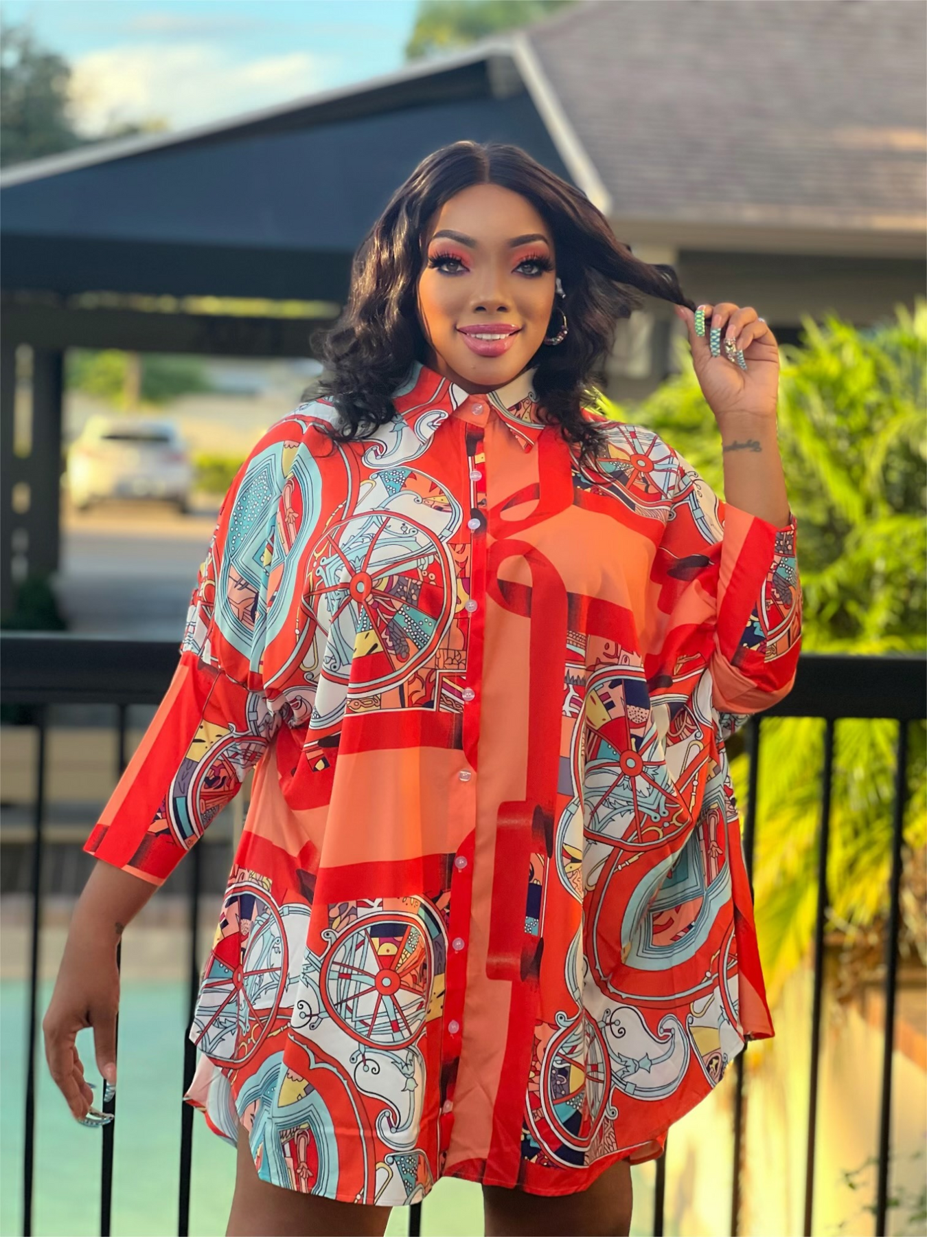 Spill the tea, sis Long Sleeve Mini Dress features a orange and peach fabrication, a baroque print pattern, a buttoned up collar, long button cinched elastic blouson sleeves, a fit and flare mini length, Complete with an pretty flouncy bodice and full button up closure. Pairs perfectly with a patent clutch and chic pumps. - 100% -polyester Model is wearing size one size fits all