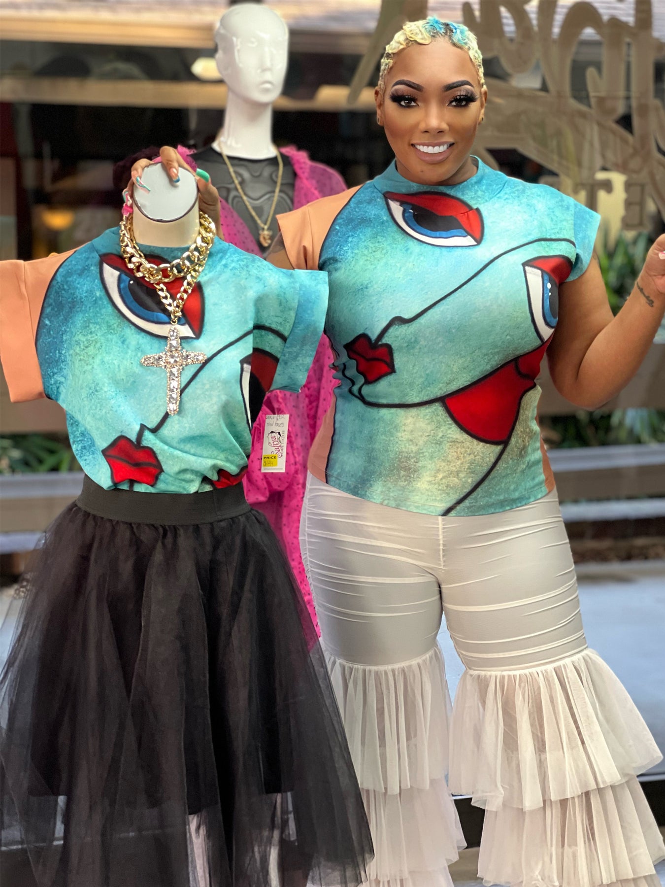 Channel your grounded energy in @safiyashoetique Earth Goddess short Sleeve blouse! This chic top piece is made from a great fabrication and features an abstract multicolor print colors with eyes , a fitted neckline, land a snap gusset button back closure. - 100% Polyester - Model is wearing size large