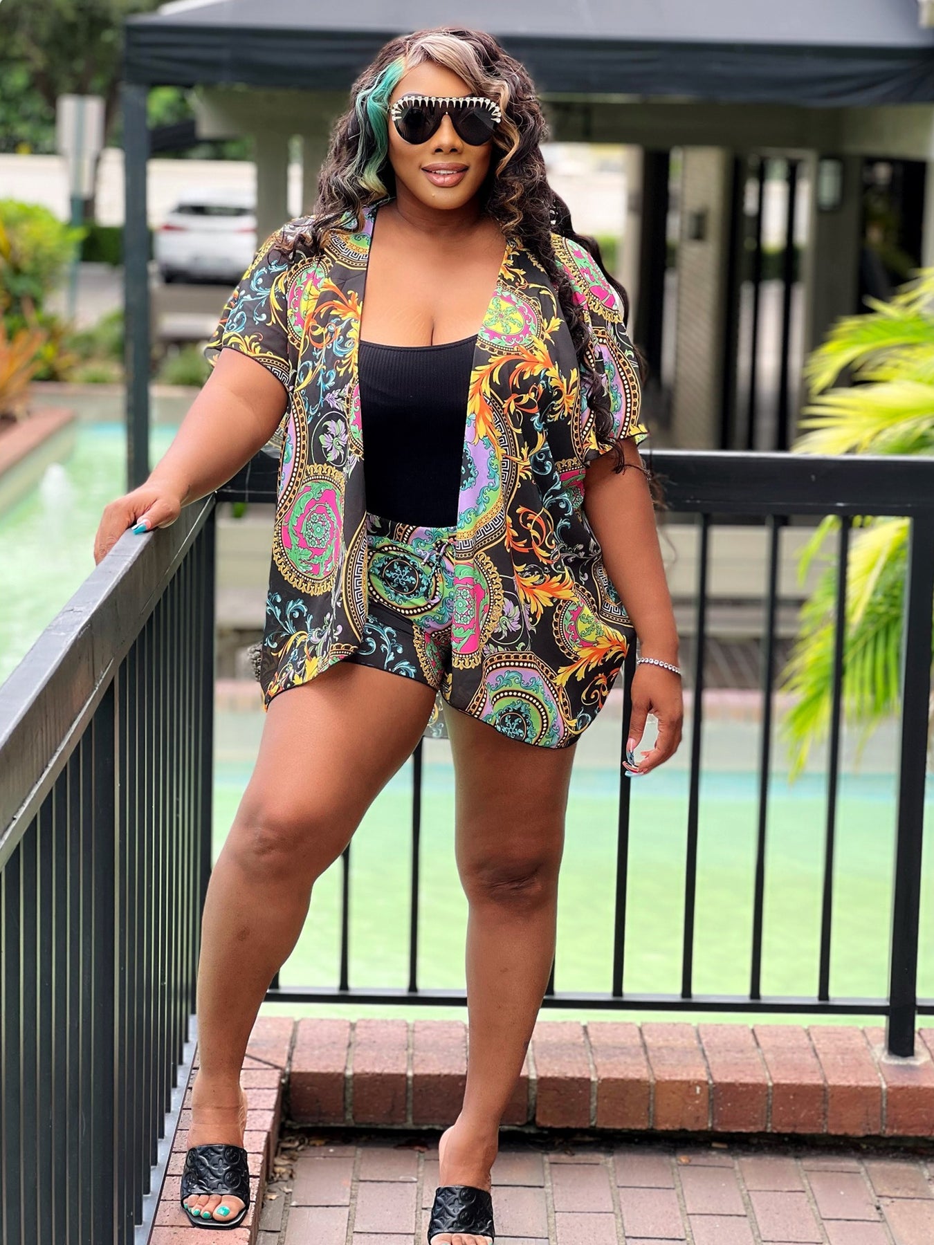 Beautiful, Baroque print finish, oversized cardigan and matching shorts with elastic waistband.