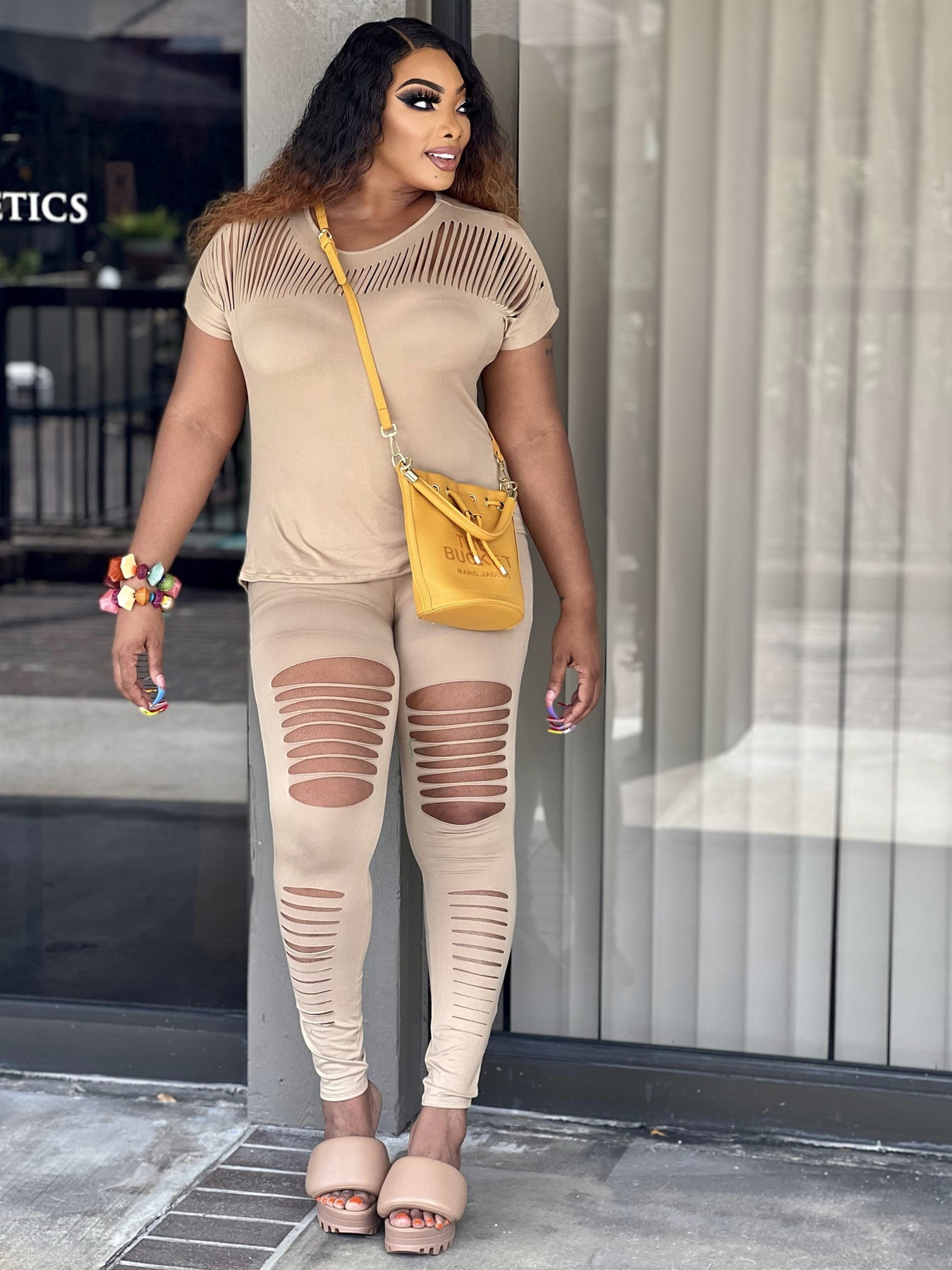 Enticing taupe Laser Cut Detail Top And Legging Set textured fabrication and features an crew neckline, short sleeve with a comfortable fit, polyester and a pull-on design. - Shell: 100% Polyester, Model wearing size large