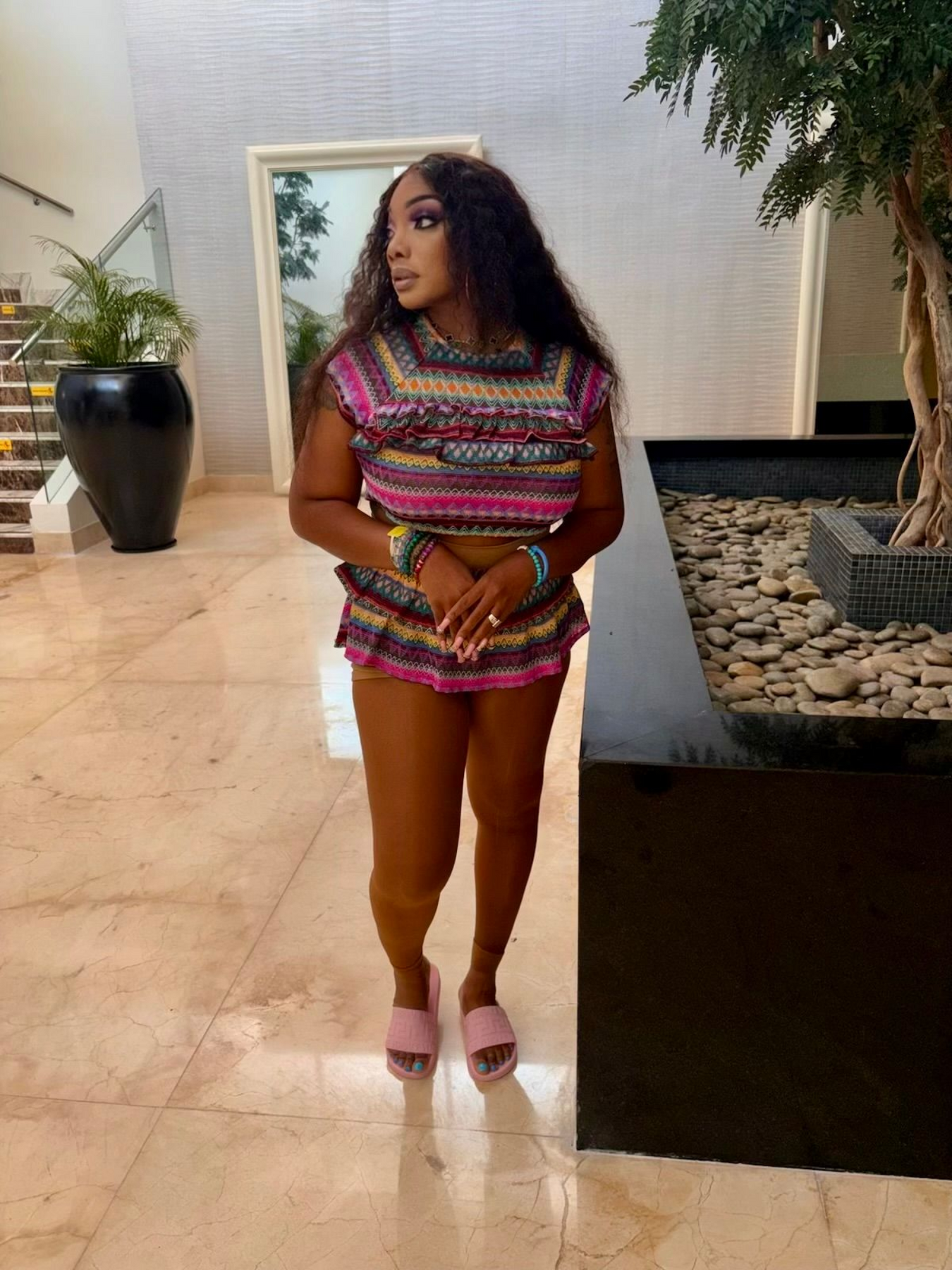 Step into bold confidence with our FIYA Fiesta Vibes Two-Piece Set, a playful yet chic outfit that brings color and personality to any occasion. Featuring a cropped ruffle-trim top with cap sleeves and matching high-waist shorts, this set is designed for maximum comfort and standout style. The vibrant multi-color print makes it the perfect look for vacations, brunch, or fun nights out.