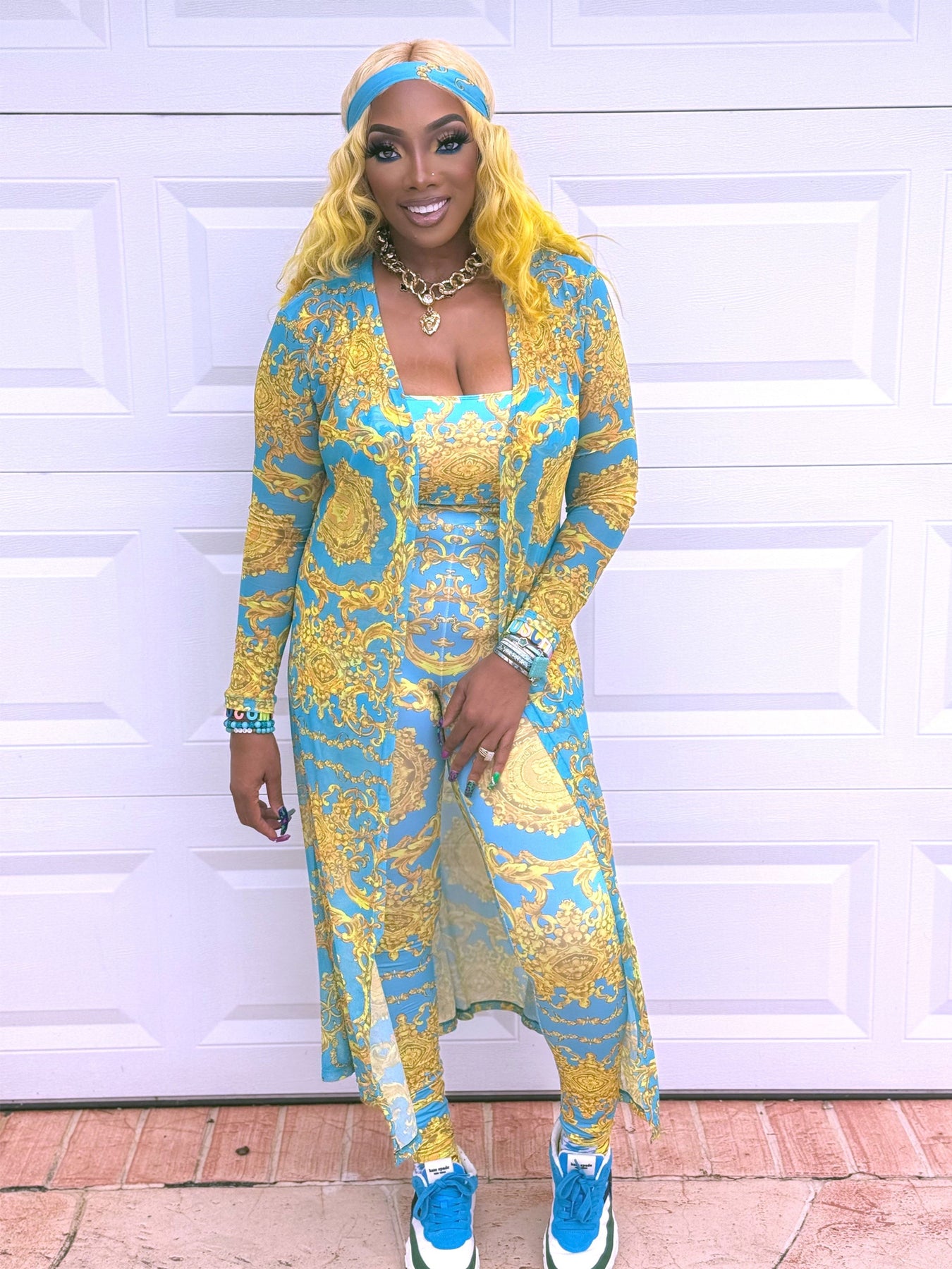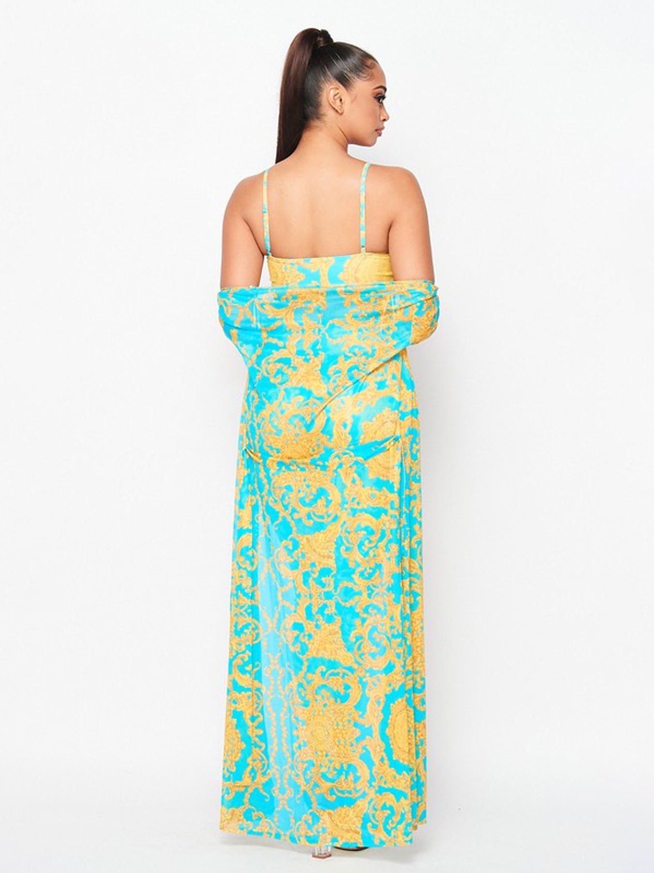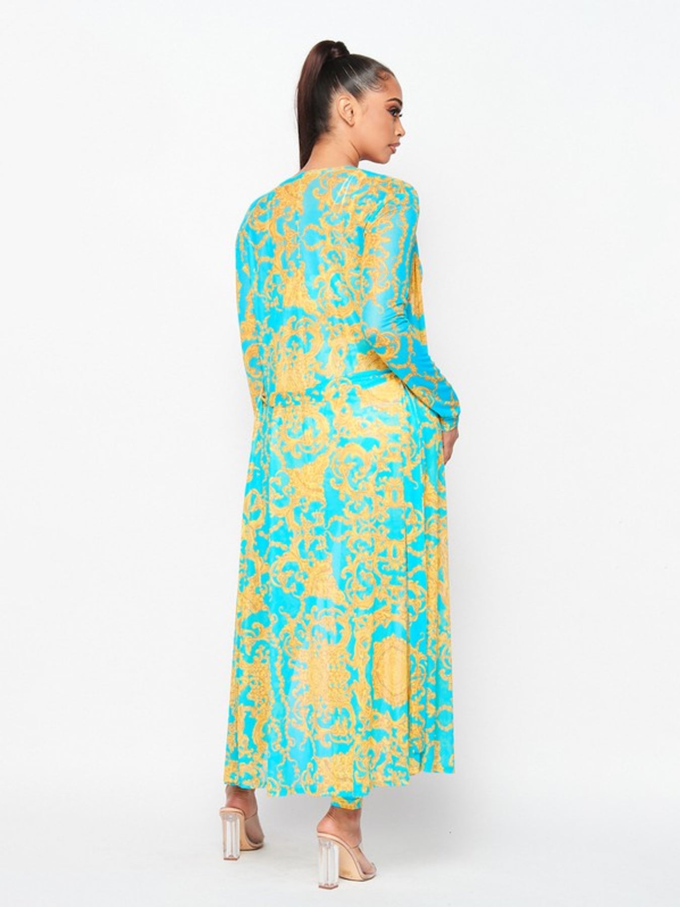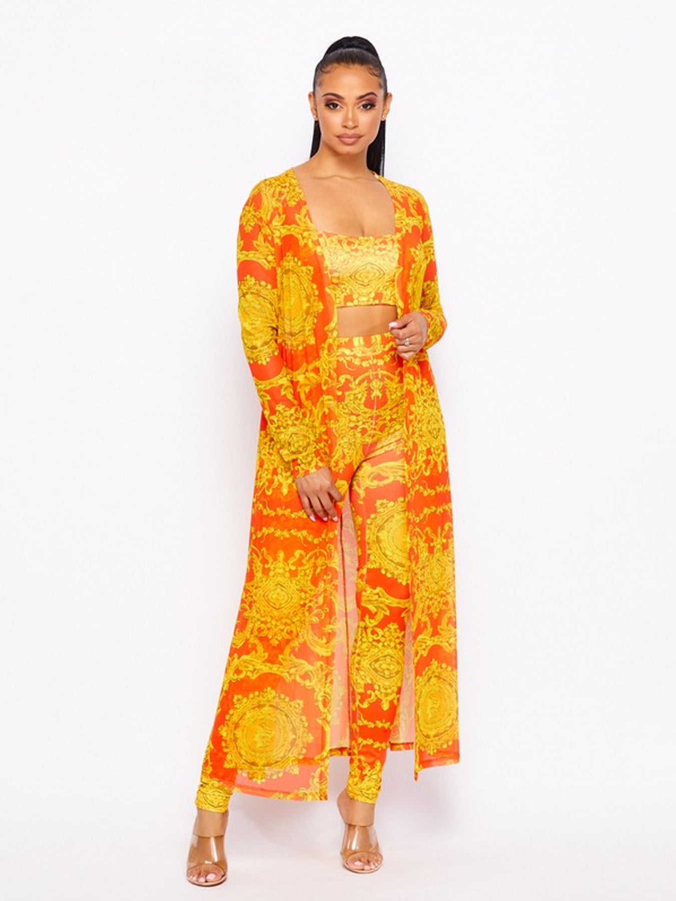 Refresh your wardrobe with a stylish 3-piece set that's perfect for everyday wear! This baroque print crop top leggings and cardigan set features on-trend prints and colors in a comfortable, flattering fit. Strappy crop top with a baroque floral print High-waisted leggings hug your curves and elongate your legs