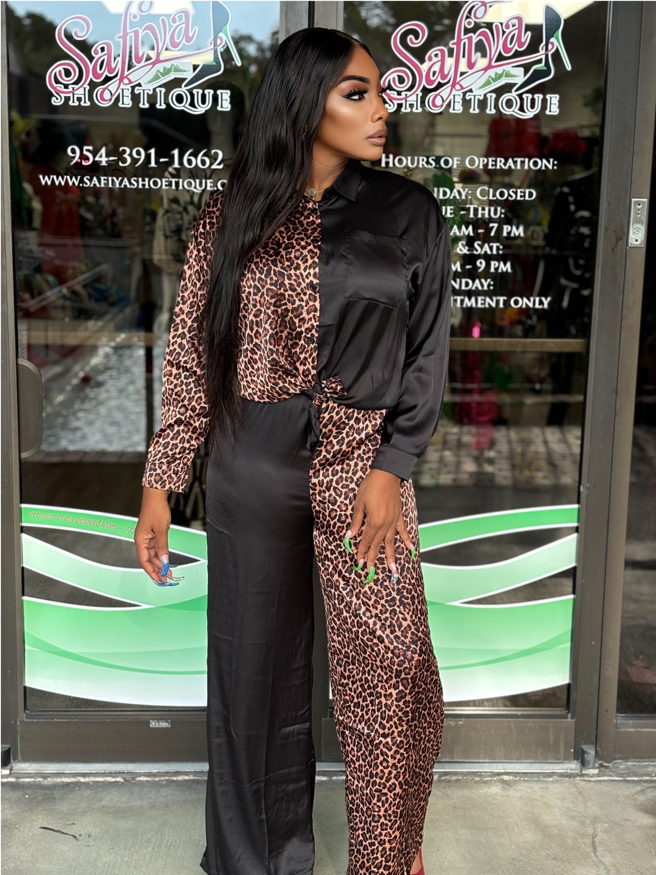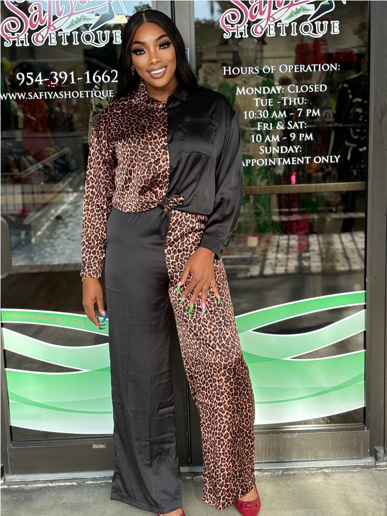 Satin Half Animal Print And Half Solid Detail Front Functional Button Down One Pocket Detail Collared Button Tab Long Sleeve Shirts Top And Elastic Waistband Half Animal Print And Half Solid Detail High Waisted Wide Leg Pants Set Model: 5' 7