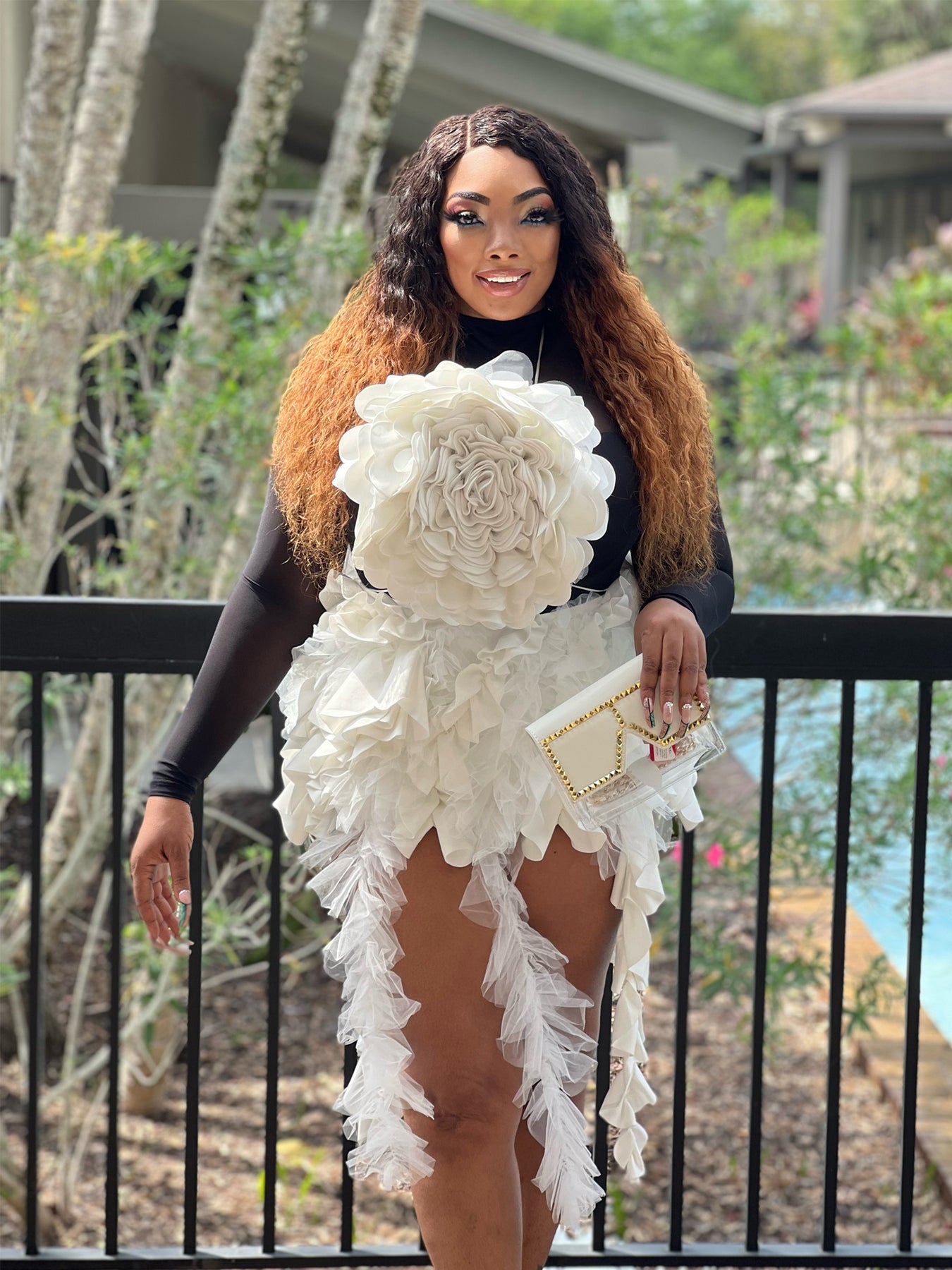 this set is made from a sleek, structured base fabrication and features neoprene fabric with roses straight across top and skirt , floral appliques throughout the bodice, stringed silhouette, top and stretchy skirt. Complete with ruffled detail, a mini length , and a tonal back zipper closure. Style with slip-on pumps and a matching clutch, for a sexy, chic look. - Main fabric: 90% Polyester 10% Spandex, - Model is wearing size medium