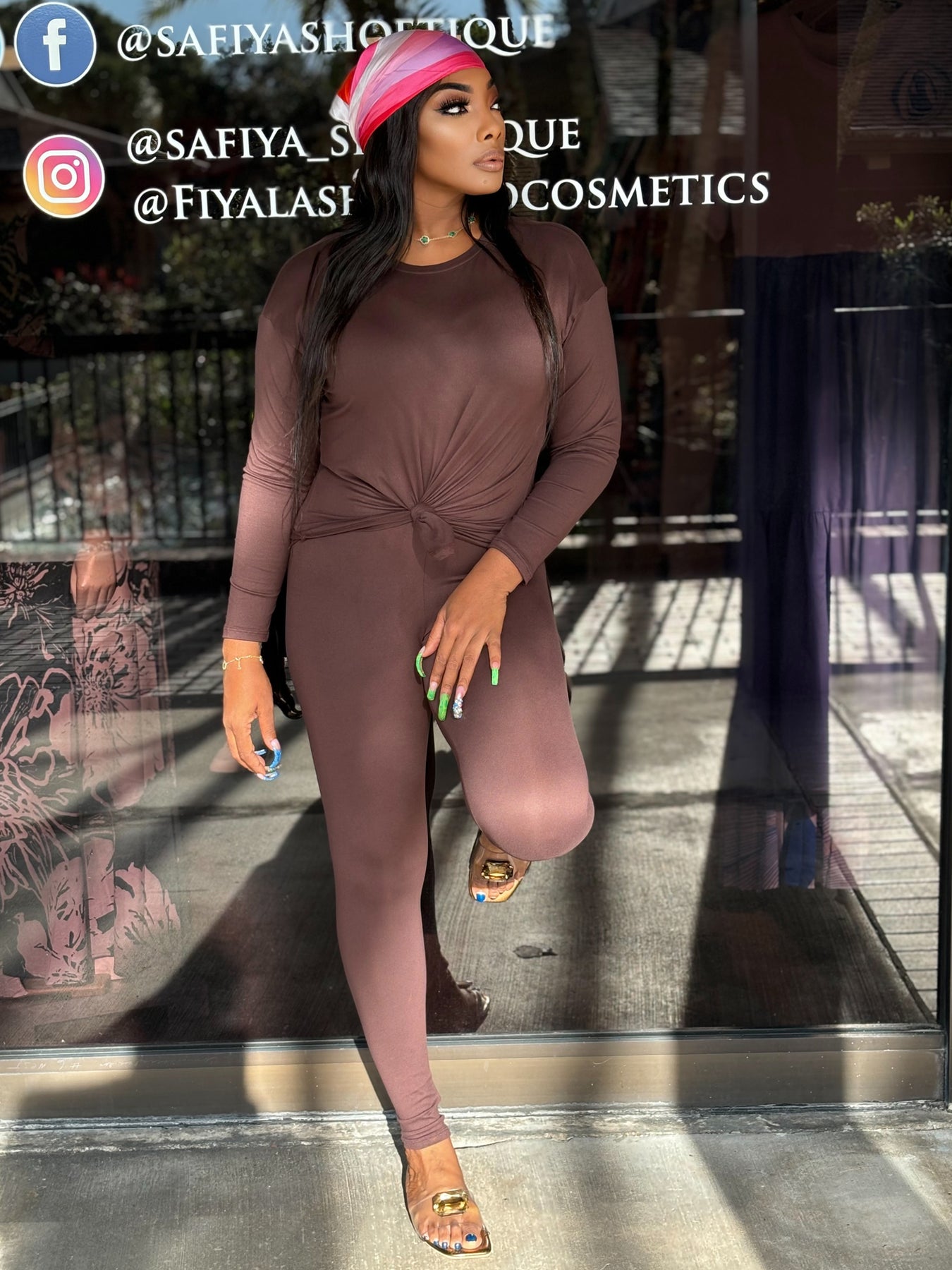 our MOYRA SET IS a beautiful mocha colored Brushed Round Neck Top Leggings Set