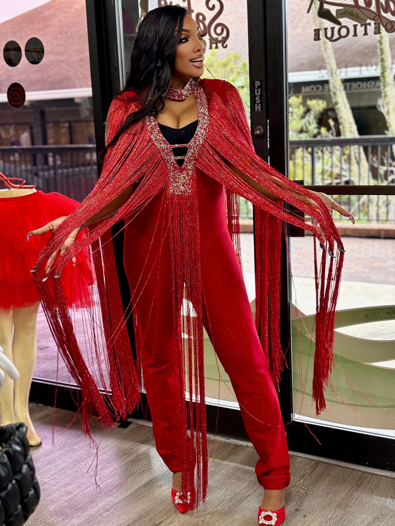 Shake your wardrobe up with NICKI ON THE FRINGE jumpsuit . This bold statement piece features a slip-on cascading fringe detailing that travels the entirety of the body, a plunging v-neckline , a sleeveless design, and pointed hems. Style with a bodysuit under to not expose too much cleavage , and studded or blinged stilettos for a bold finish.