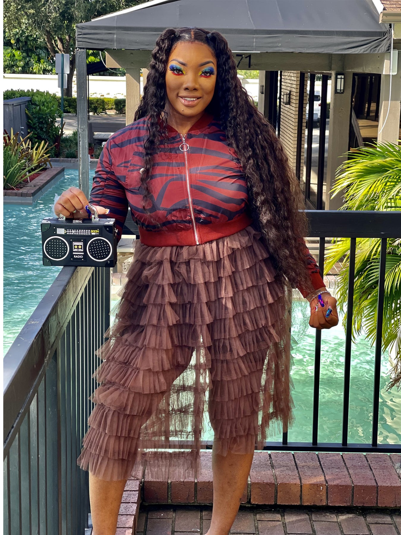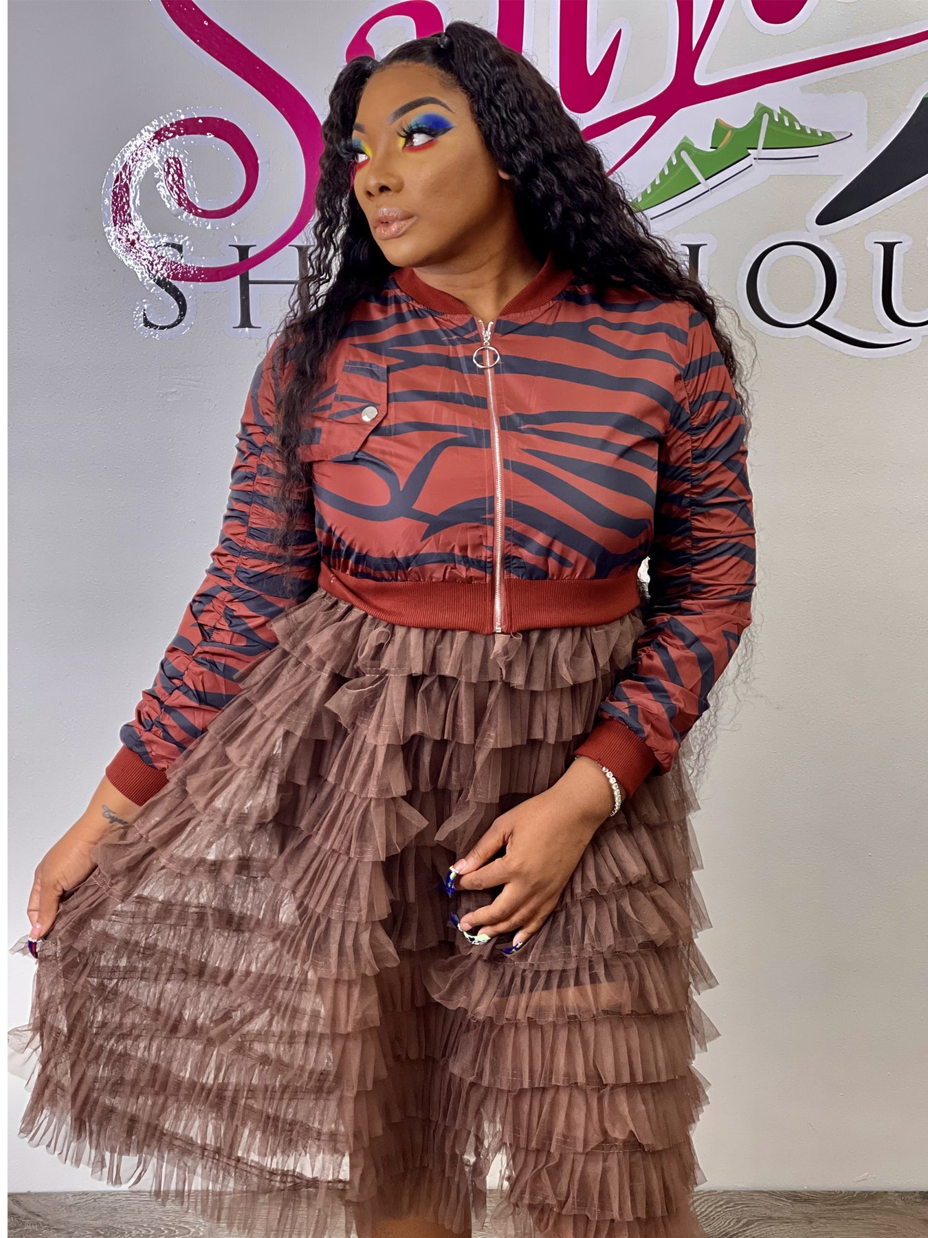 Premium quality, tigered zipper down jacket . Pair it with any of our high waist leggings for the complete look. Super cute and an absolute must have! Animal print long sleeve zipper front jacket *Featuring with net yard lace bottom *Ruffled Cardigan *100%Polyester *