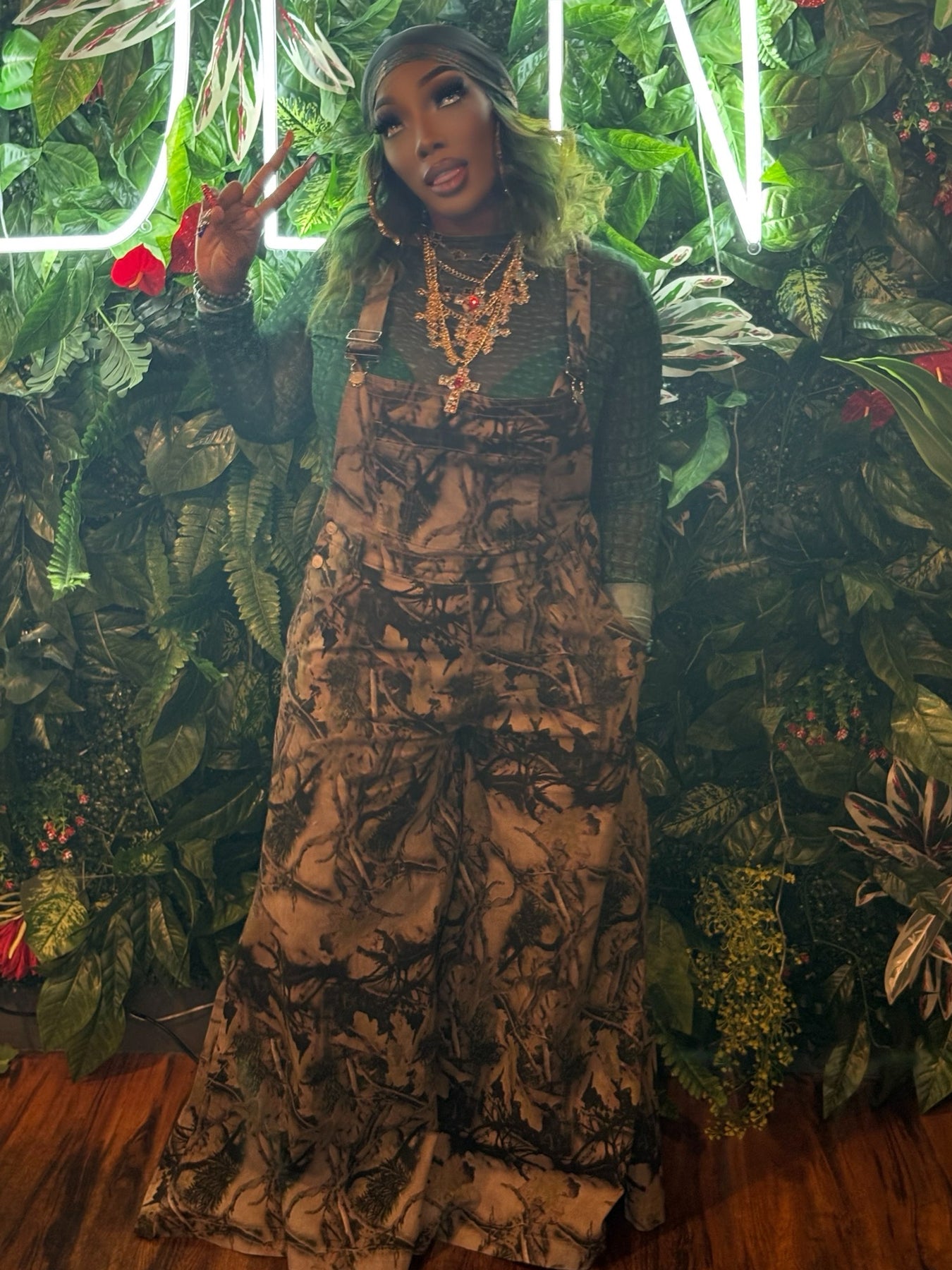 Turn heads this season with our Overall Camo Couture Jumper – the perfect mix of street-style edge and high-fashion drama. Featuring a bold oversized silhouette, this wide-leg jumper gives you room to move while keeping it chic and on-trend. The camouflage print blends earthy tones for a statement look that pairs perfectly with everything from crop tops to sleek bodysuits.