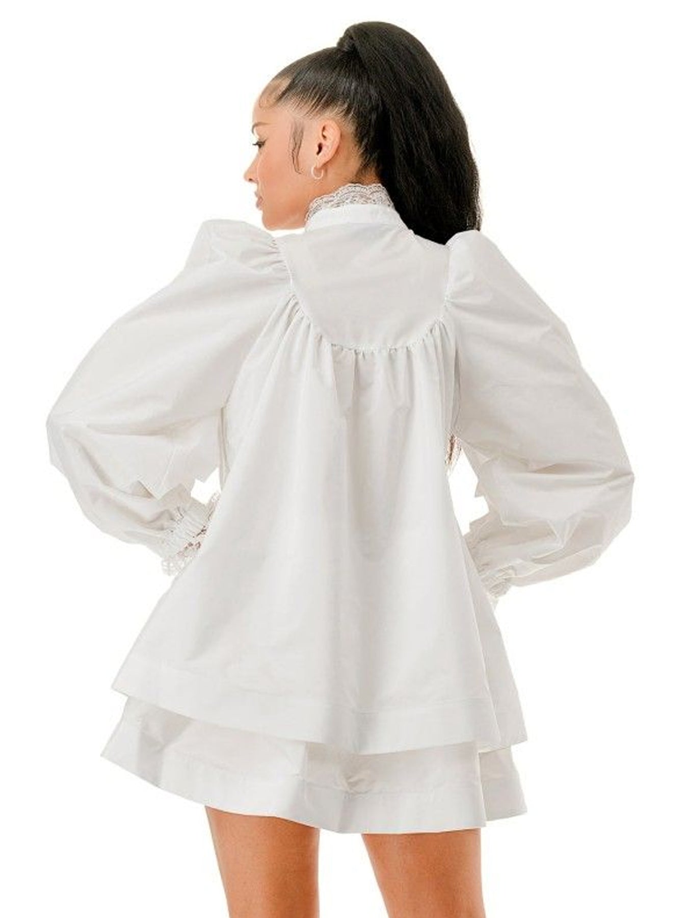Step into effortless sophistication with this stunning layered white set. Featuring a dramatic puff-sleeve blouse with delicate lace details and matching tiered shorts, this look blends classic romance with modern edge. Perfect for brunch, special events, or a stylish day out, this set makes a bold yet feminine statement. Pair with heels or boots for an elevated finish.
